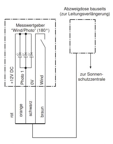 Der WAREMA MWG Wind/Photo (180°) wird mit einem Befestigungswinkel im Außenbereich montiert und ist für den dauerhaften Einsatz unter verschiedensten Witterungsbedingungen ausgelegt. Die Anschlussleitung kann bei Bedarf auf bis zu 200 Meter verlängert werden. Für eine zuverlässige Funktion ist eine UV-beständige, witterungsfeste Außenleitung (z. B. 4 × AWG 24 C UL) erforderlich.
